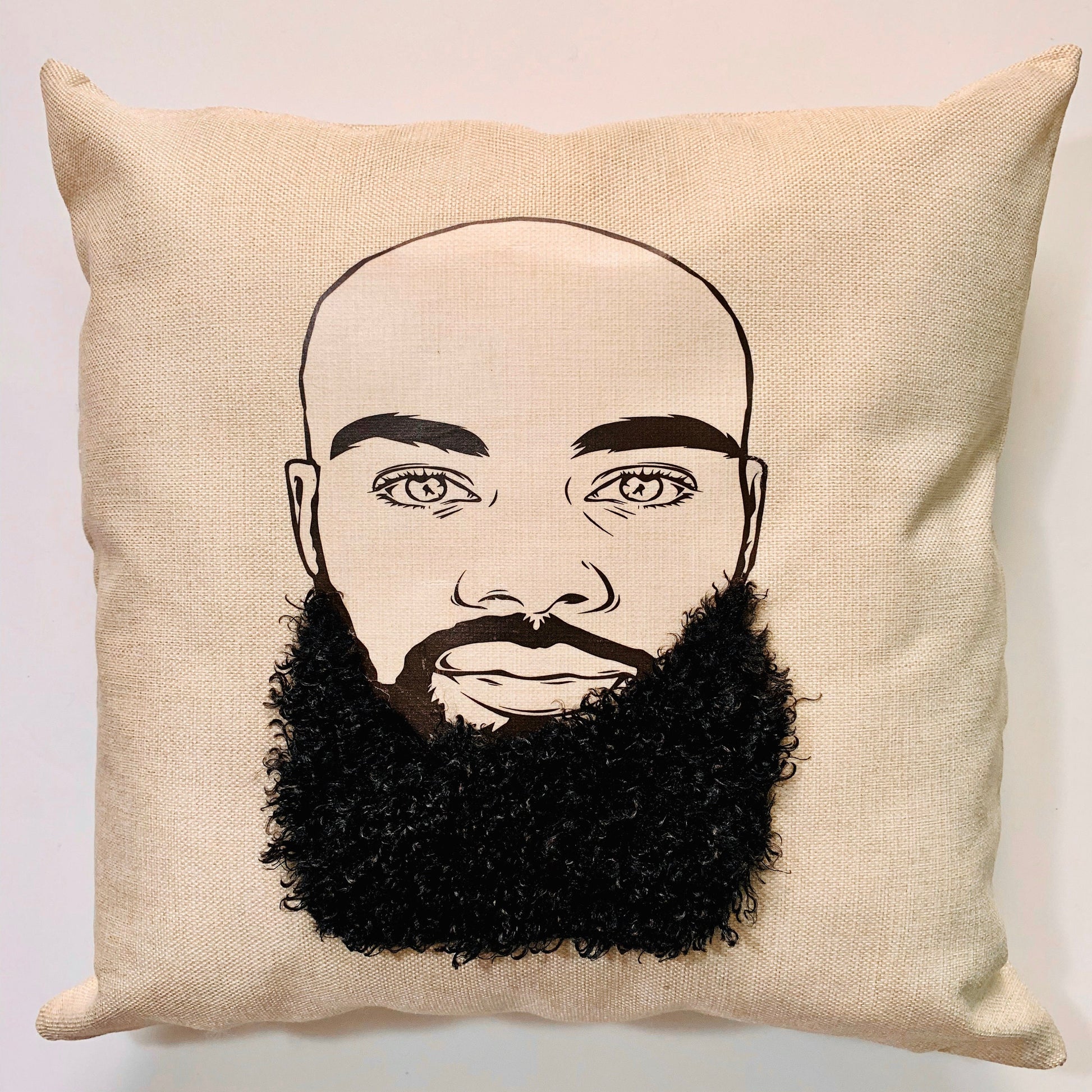Design by Aymara. 16 x 16 pillow Bald Beard Man Cream and Black