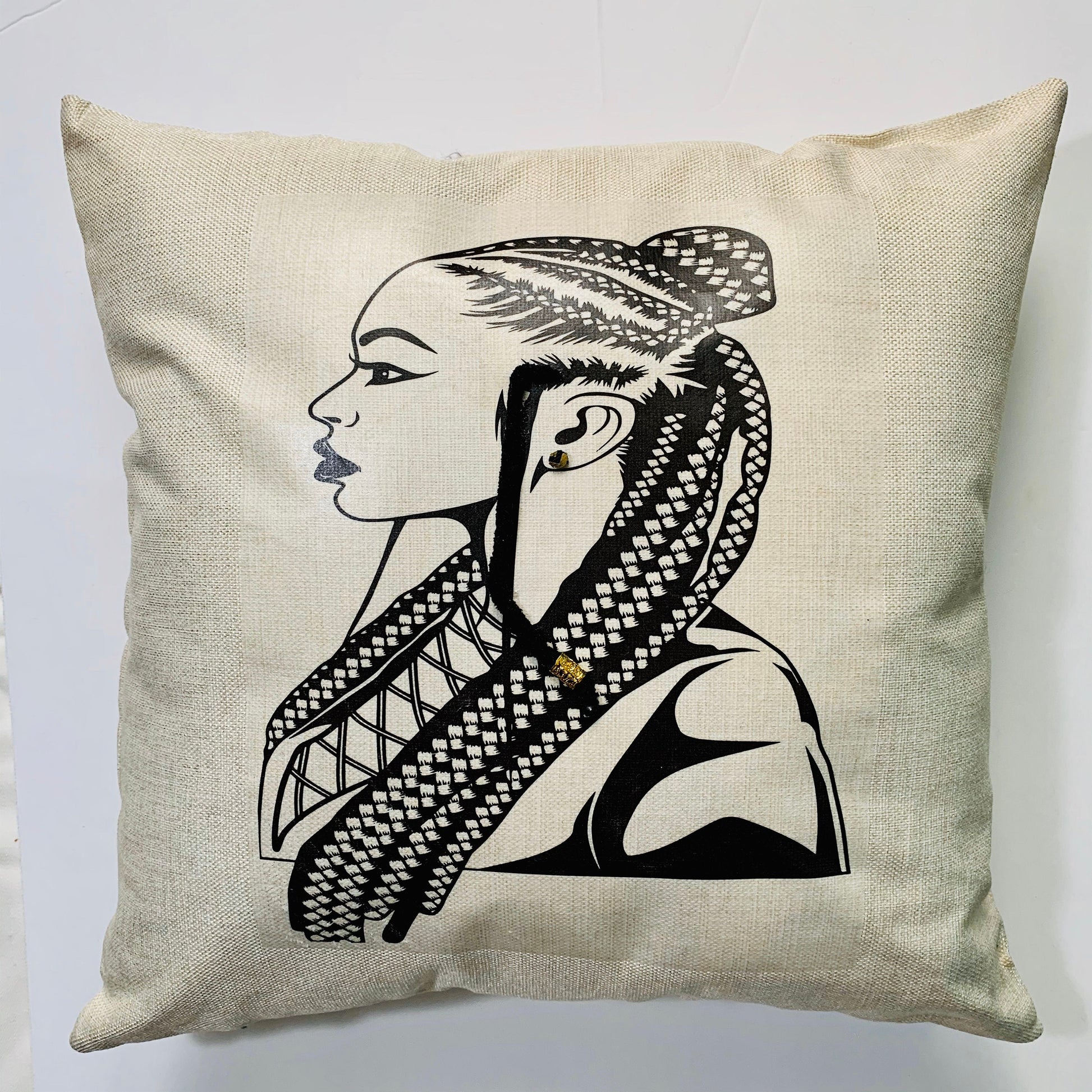Design by Aymara. 16 x 16 pillow Afro Cornrow Lady. Cream and Black