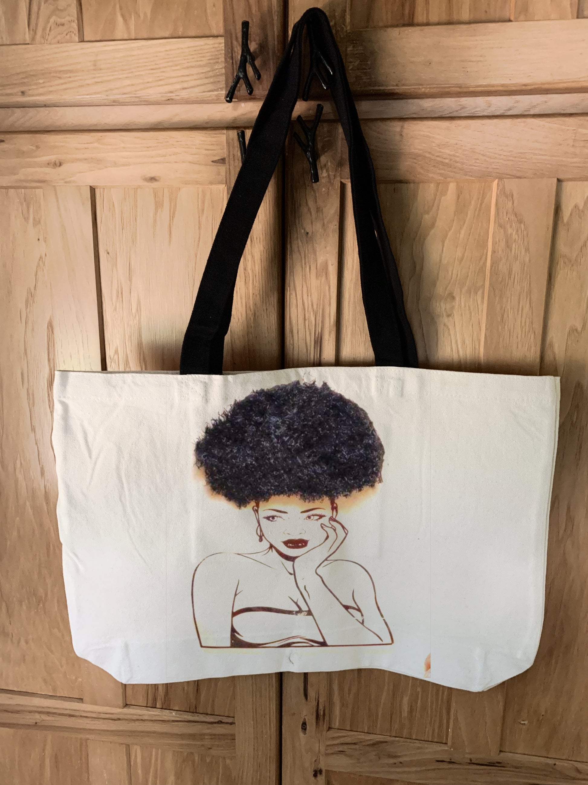 This large tote bag is not your typical tote bag. It has an image of an African American woman on it with textured hair. Soft afro puffs, cornrows or braids are added to the tote for a realistic look and texture.